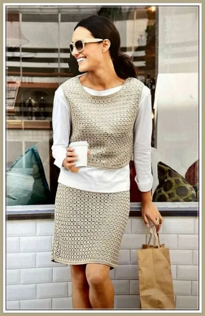 Вязаный костюм из короткого жилета и прямой юбки крючком