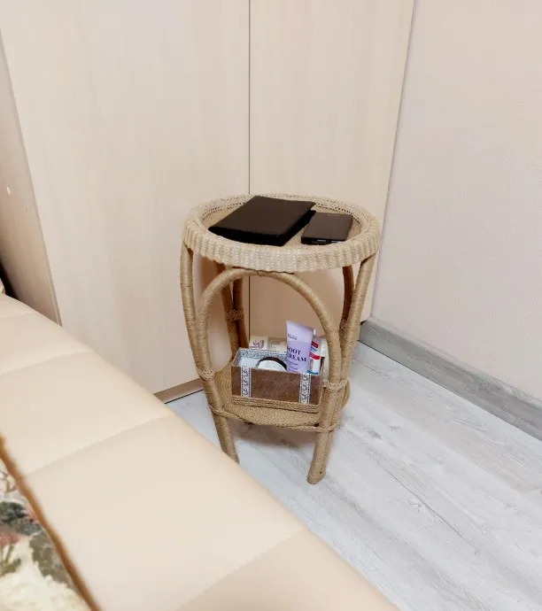 Столешница выполнена из крышки от пластикового ведра (из-под шпаклевки),обвязана джутом и украшена джутовым кружевом, нижняя часть тоже из пластиковой крышки. ножки из пластиковых труб для водоснабжения, обмотаны джутом. (все осталось от строительства и отделки дома)