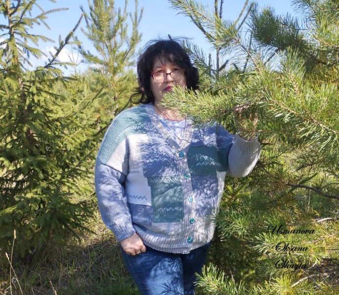 Приветствую всех! Кардиган связан из остатков пряжи с метражом 200м(228м) в 100гр. - Мериносовая от Пехорки, Superlambs Special от Нако, спицы №4, полушерсть. Вес готового изделия 500гр. На мой "не маленький размер"-это неплохо! При этом он получился очень уютным, мягким и тёплым - в качестве "рабочей лошадки" на повседневное использование. Можно и дома носить ,когда прохладно и до магазина сбегать пригодится.