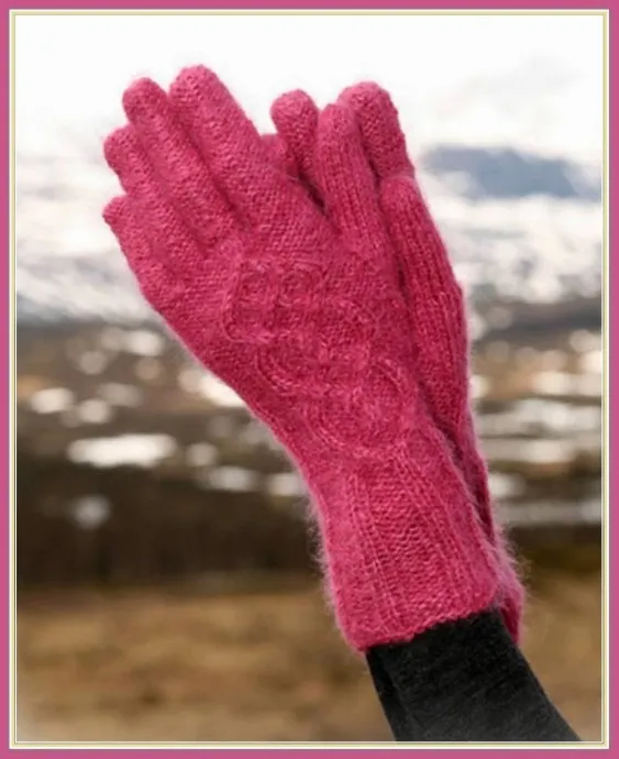Перчатки с арановым узором спицами из пушистой мягкой пряжи