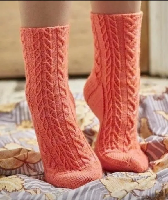 Установочный круговой ряд: 1 петлю снять, нить за петлей, 18 (20, 20) лицевых петель, набрать и провязать лицевыми 16 петель вдоль бокового края стенки пятки (по 1 петле на каждую снятую петлю края), провязать 33 (37, 41) петли верхней части стопы следующим образом: 1 (2, 3) изнаночная петля, 9-й ряд рисунка А, 2 (3, 4) изнаночные петли, 9-й ряд рисунка В, 2 (3, 4) изнаночные петли, 9-й ряд рисунка А, 1 (2, 3) изнаночная петля; набрать и провязать лицевыми 16 петель вдоль второго бокового края стенки пятки, 35 (37, 37) лицевых петель.