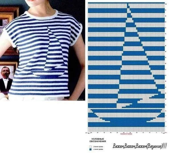 Кстати, его можно связать в технике филейного вязания, синие полоски заменив на плотное полотно.