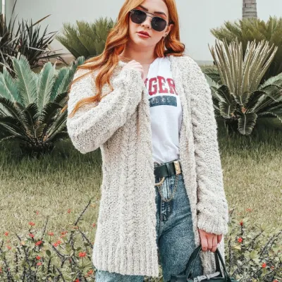 Чтобы связать этот славный «мякиш», нам необходимо будет взять 10 мотков — на размер 44-46 — светло-серой буклированной пряжи: 100% акрил; 100 гр — 100 м. Спицы № 6.