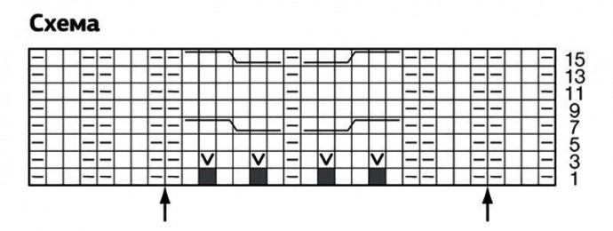кром., 0 (4) п. до 1-й стрелки, выполнить 6 раппортов = вначале 90 п., 4 (8) п. после 2-й стрелки, кром.