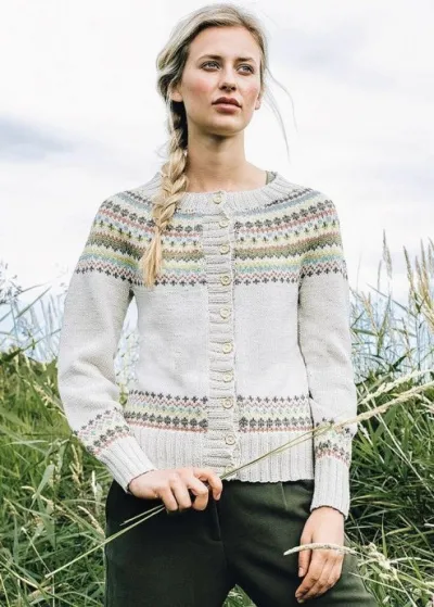 Для бейки горловины набрать на круговые спицы № 3 дымчато-белой нитью по 1 п. из каждой петли/ряда горловины, включая узкие верхние края планок застежки полочек, но пропуская каждую 4-ю п./р. = 152 (157 - 162 - 167 - 172) 177 п. Вязать 5 рядов резинкой 2x3, при этом ряд заканчивать 2 лиц.