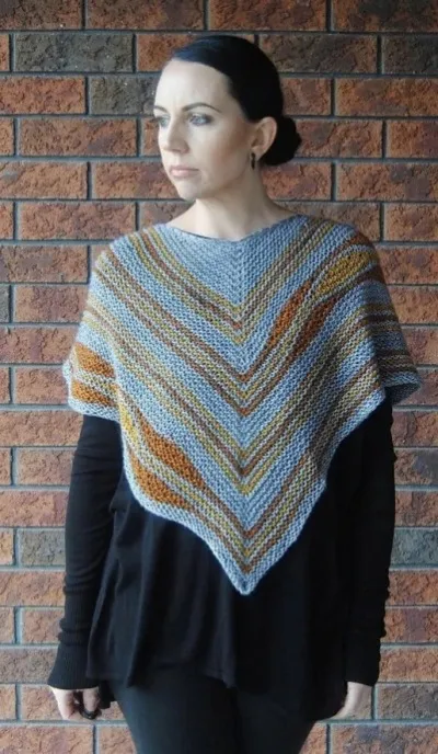 Теплые осенние цвета растекаются и мерцают в этой треугольной шали, связанной из нити средней толщины.