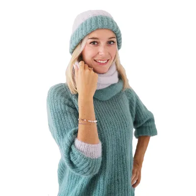 Вам потребуется: пряжа Schulana Kid-Seta (70% мохера, 30% шёлка; 25 г / 210 м) - 2 мотка мятно-зелёной (цв. 144), 2 мотка серебристо-серой (цв. 1); чулочные спицы № 5.