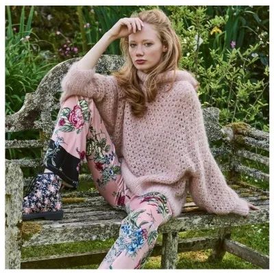 Пряжа (70% мохера, 30% шелка; 210 м/25 г) — по 100 (125) г цвета розового дерева, пудрово‑розового и нежно‑розового; спицы №5 и 7; круговые спицы №5.