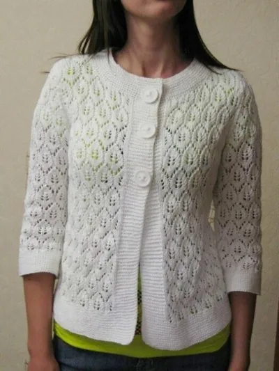 Белый жакет с рукавами 3/4 связан ажурным узором, планки выполнены платочной вязкой.