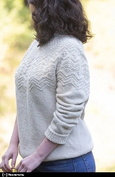 Основная часть и рукава вяжутся круговыми спицами по кругу снизу вверх до пройм, затем соединяются для вязания кокетки. Укороченные ряды вяжутся от начала кокетки , сразу после соединения деталей. Способ вязания "обернуть и повернуть".