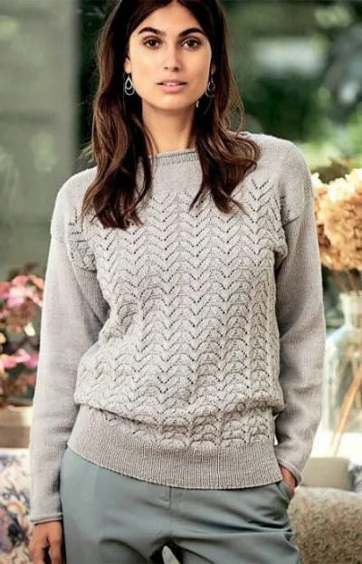 Пуловер вяжется лицевой гладью, за исключением воротника-лодочки и ажурного узора на переде.