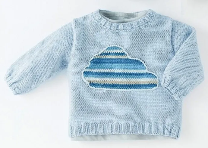 Яркое облачко на однотонном фоне выполнено в жаккардовой технике и вышито по контуру стебельчатым швом.
