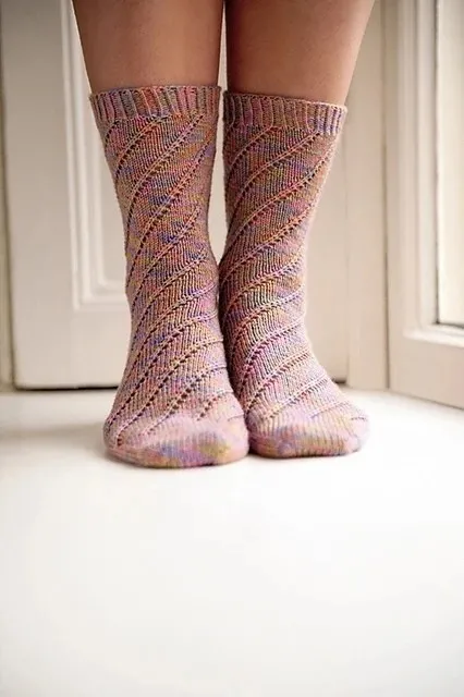 Продолжать вязать рисунок только на верхней части стопы, провязывая линии как: 2 петли провязать вместе лицевой с наклоном вправо, 1 накид. Когда эти линии достигнут границы верхней части, далее эту линию не продолжать. Когда над последним накидом будет находиться 8 петель, начинать вязать новую линию. Расстояние между линиями 6 петель, как и прежде. Каждый второй ряд провязывается только лицевыми петлями.