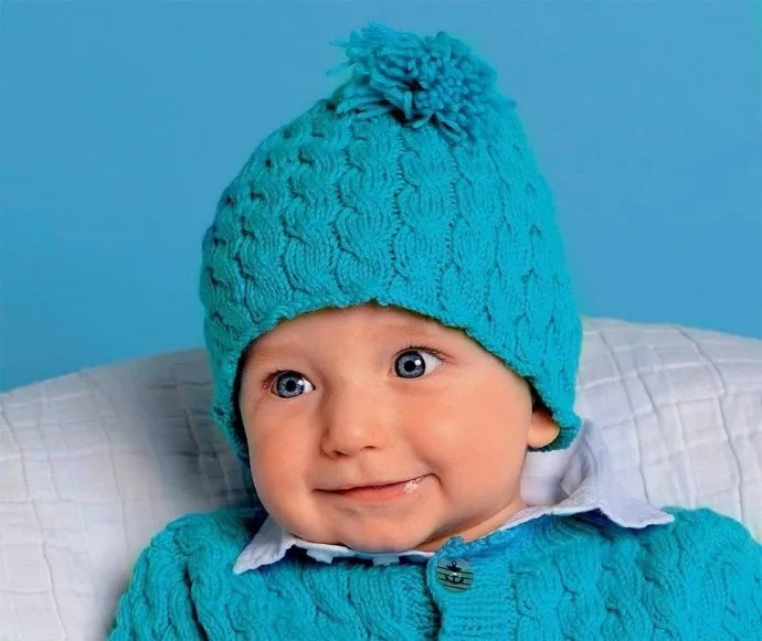 Сплошной узор из кос и смешные кисточки на макушке делают эту несложную шапочку очень милой и интересной.