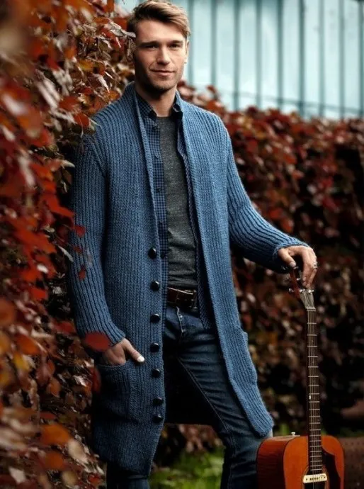 Этот стильный мужской кардиган на пуговицах легко заменит укороченное демисезонное пальто.