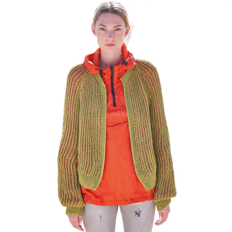 Сборка: выполнить регланные швы. На круговые спицы № 4 набрать по передним краям полочек зелёной нитью по 81 (88) п. и вязать для планок 7 р. платочной вязкой. Затем петли закрыть. На круговые спицы № 4 набрать по краю горловины, включая короткие стороны планок, 97 п. (на участках рукавов край припосадить) и вязать для бейки 11 р. платочной вязкой. Затем петли закрыть. Выполнить швы рукавов и боковые швы.