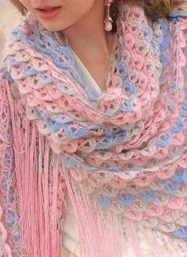 Шаль выполнена из пряжи разных оттенков античной розы и бирюзы. Изысканный контраст достигается использованием пряжи разной фактуры - узор из тонких лепестков, трепещущих на гладкой сетке из вискозного шелка.
