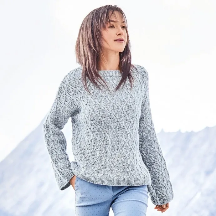 Интересный узор с косами из снятых петель и пряжа из шерсти и шелка делают этот джемпер женственным и комфортным.