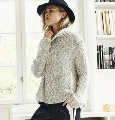 Свободный свитер спицами с широким рельефным узором по центру переда