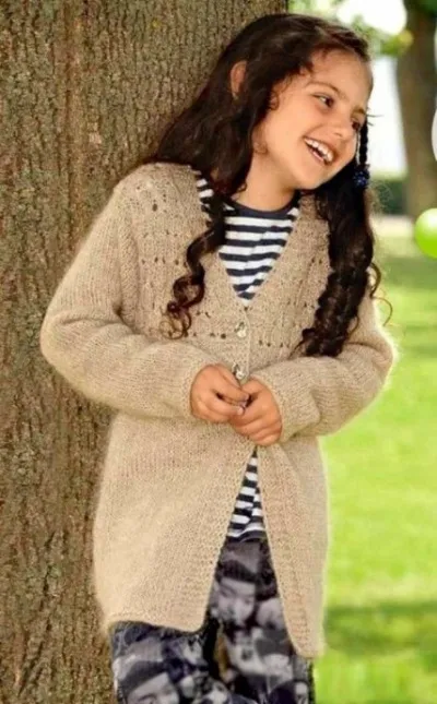 Правая полочка: вязать симметрично, но с 3 отверстиями для пуговиц. 1-е отверстие для пуговицы выполнить через 27 (29) 31 см от планки (в 5-м р. платочной вязки): 3-ю и 4-ю п. провязать вместе лиц. и выполнить 1 накид. Следующие 2 отверстия выполнить с интервалом 12 р. Для скоса выреза после п. планки выполнять 1 протяжку (снять 1 п. как лиц., 1лиц. и протянуть её через снятую п.).
