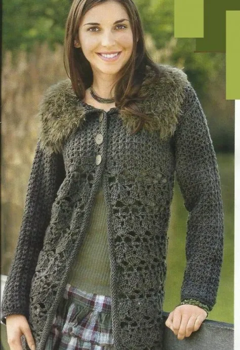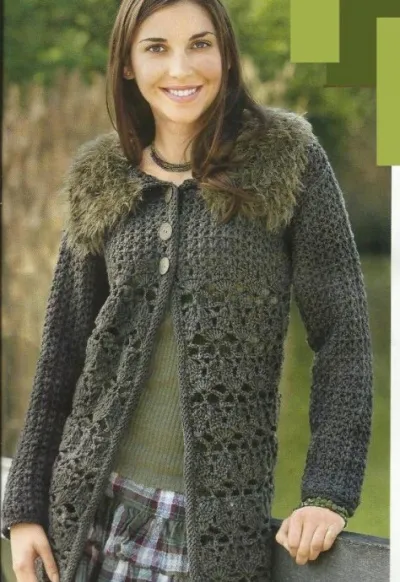 Кардиган «Олива-Прованс» -«изюминка» такого жакета — это крупный ажурный узор, который можно связать спицами. Воротник сделан не из меха, а из специальной пряжи, которая имитирует его.