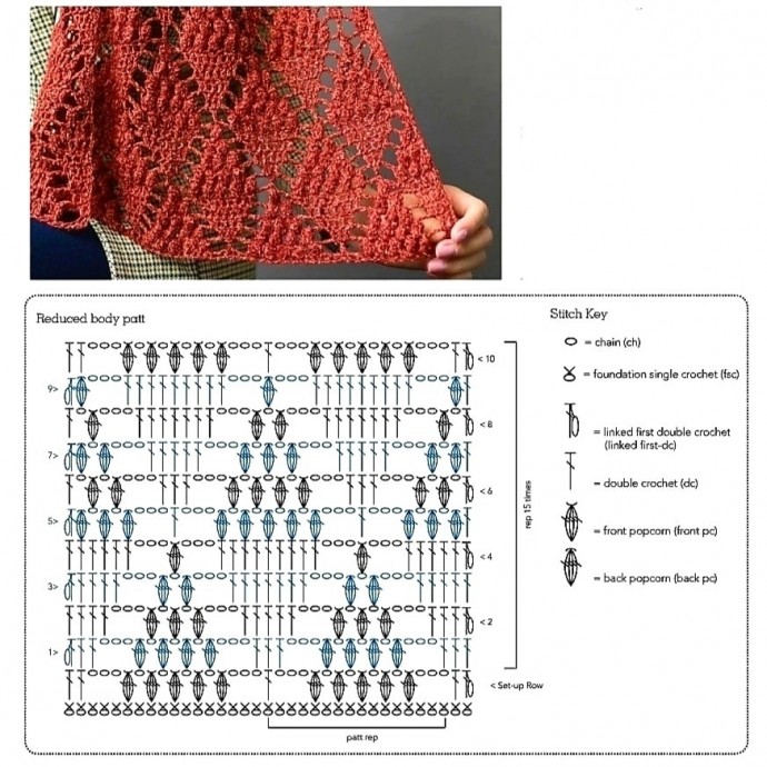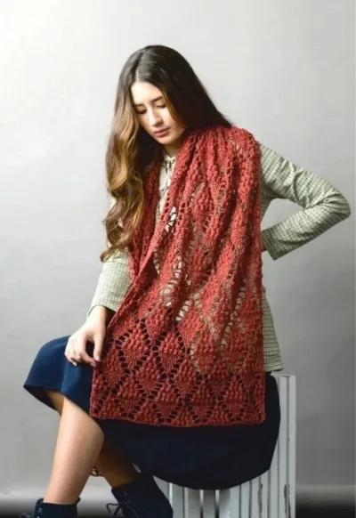 Шарф «Cardinal» крючком узором из ромбов с элементом «попкорн»