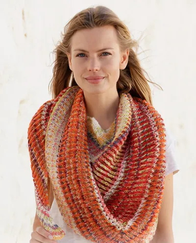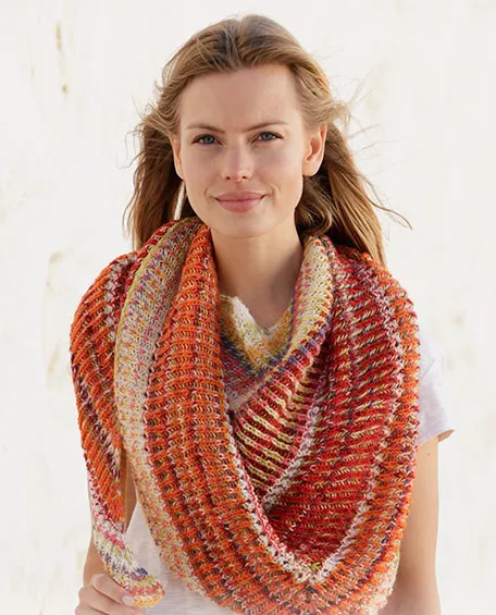 Вам потребуется: пряжа DROPS Fabel от Garnstudio (75% шерсти,25% полиамида; 205 м / 50 г) - 150 г жёлтой/розовой, по 50 г белой, красно-терракотовой и многоцветной; круговые спицы № 4.
