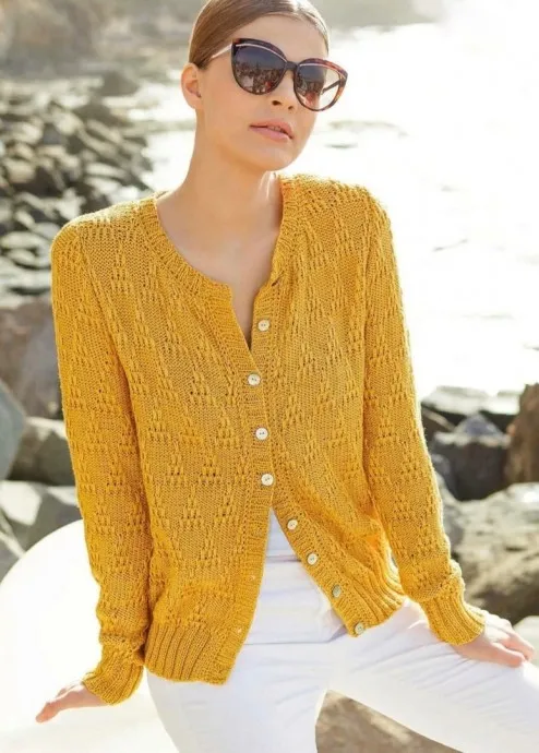 Жёлтый жакет кардиган кофточка с фактурным узором спицами
