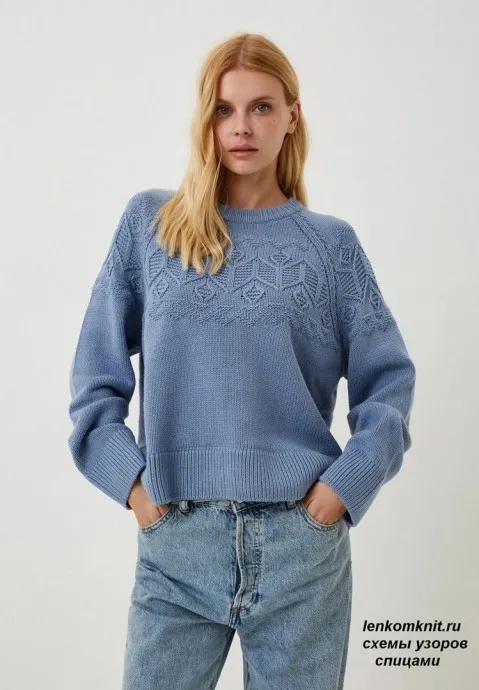 Схема нарисована для вязания узора снизу вверх. Если вязать джемпер регланом сверху на круговых спицах, схему можно просто перевернуть, она все равно будет понятной (узор простой).