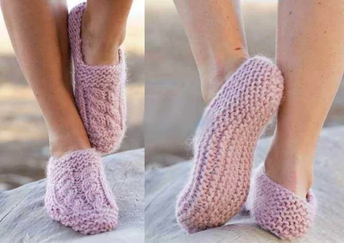 Прелестные розовые тапочки спицами вяжутся из толстой шерстяной пряжи. Схемы даны для трёх размеров: 22 см. длина ступни — размер 35/37 (a), 24 см. длина ступни — размер 38/39 (b), 26 см. — 40/42 (c). Вяжем на двух спицах, третья — дополнительная — нужна для рисунка «коса». Основная вязка — платочная (лицевыми).