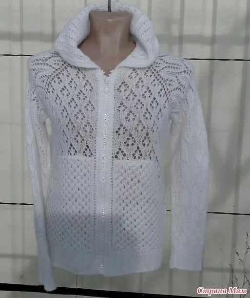 Женская вязаная толстовка с капюшоном, карманами «кенгуру» и застежкой на молнии, так называемая «худи», выполняется различными ажурными рисунками.