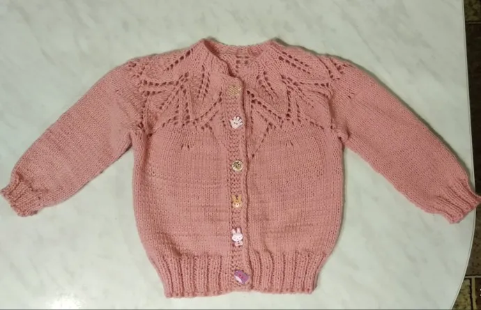 Связалась кофточка на малышку 1 года из пехорки детский каприз. Ушло 3 мотка пряжи. Вязала в 2 нити.