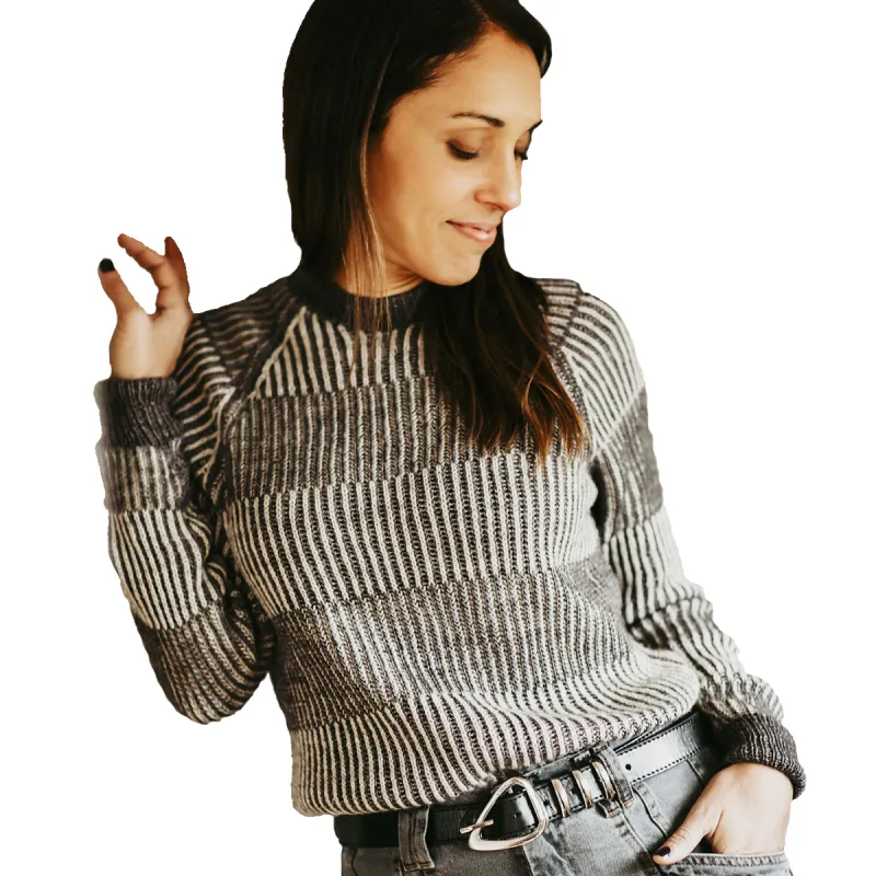 Полосы резинки чередуются с полосами двухцветной резинки бриошь, разделенные узкими полосками платочной вязки.