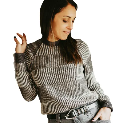 Пряжа цвета Б: 2 (2, 2, 2, 3, 3, 3, 4, 4) мотка Singles от Norne Yarn (65% меринос / 20% шёлк / 15% як; 480 м; 120 г); или 624 (720, 816, 912, 1080, 1248, 1344, 1584, 1728) м супертонкой пряжи. Представлен в цветовой гамме кукуруза (тёмно-серый).