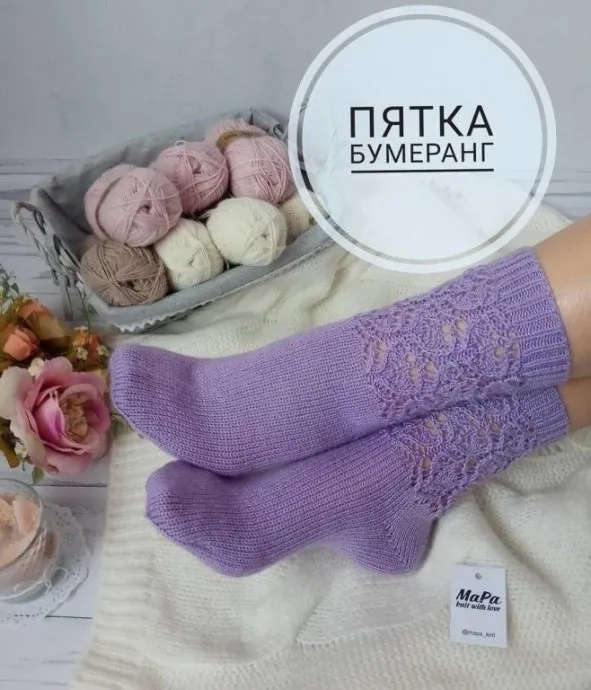 1-й ряд(= лиц. ряд): петли 1-й трети плюс петли нижней части пятки провязать лицевыми (=20п.), повернуть; 2-й ряд: (= изн. ряд): начать с двойной петли нижней части пятки провязать изнаночными (=9п.), повернуть; 3-й ряд: начать с 1-й двойной петли и до 2-й двойной петли вязать лицевыми, затем двойную петлю и следующую петлю провязать лицевыми, повернуть; 4-й ряд: начать с двойной петли и до следующей двойной петли вязать изнаночными, затем двойную петлю и следующую петлю провязать изнаночными, повернуть. Повторять 3-й и 4-й ряды до тех пор, пока в работе не будут все петли. Затем на всех петлях вязать по кругу стопу ( без убавок для клина подъёма стопы) до начала мыска.