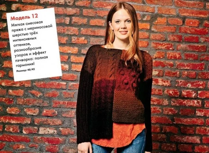 Джемпер спицами асимметричного кроя с эффектом пэчворка из секционной пряжи