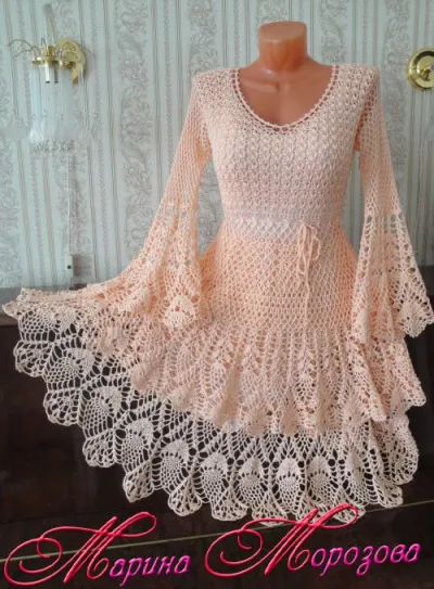 Девчата! Подскажите,пожалуйста.может у кого-то в закромах есть схемы и описания подобных платьев? Именно это платье авторское,автор не делится схемами,но может кто-то что-то похожее встречал?)