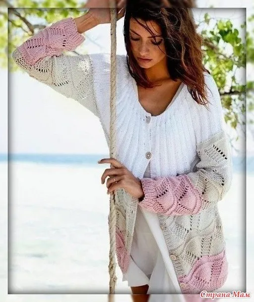 На спицы №6 набрать для планки застежки по переднему краю левой полочки, начав от горловины, 29 (33) п. белой нитью, 32 п. светло-серой нитью, 16 п. серо-бежевой нитью, 24 п. розовой нитью и на всех 101 (105) п., начав с изн. ряда, вязать от разных клубков резинкой А. Чтобы при смене цвета не образовывались отверстия, нити перекрещивать на изнаночной стороне работы. Через 7 р. от начала планки петли последнего ряда закрепить иглой.