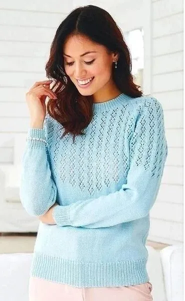 Вязаный спицами пуловер-реглан с ажурной кокеткой готов.
