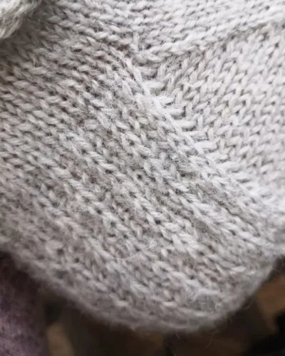 Итак, делим все петли носка на 2 части, у меня это 29 узора и 27 петель глади. Пятка расположена будет со стороны глади, поэтому я сначала провяжу 29 петель узора. А после этого приступаю к пятке.