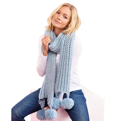 Сделать 4 помпона диаметром 10 см из остатков пряжи или использовать помпоны из искусственного меха. Прикрепить помпон в каждом углу шарфа. Вплести концы нитей. Перевод ©Pushitsa