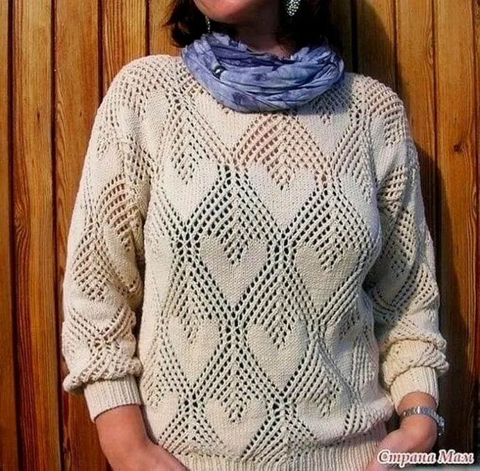 Ажурный сердечный джемпер спицами
