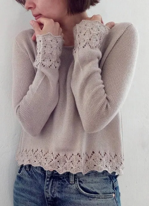 Хочется связать что-то простое, но с изюминкой? Хочется вязать лицевой гладью? И в то же время, чтобы был стильный акцент? — тогда ваш выбор кофта спицами лицевой гладью, но с красивой каймой снизу и по рукавам. Думаю для вязания кофты спицами с такой каймой лучше всего использовать пряжу средней толщины 400-500 метров в 100 гр. В пряже около 200 метров эта кайма будет смотреться грубо и некрасиво. Рапорт узора 12 петель, поэтому наборный ряд любой детали должен ровно делиться на 12 + 2 кромочные петли. А вот дальше, при вязании лицевой гладью можно будет регулировать количество петель.