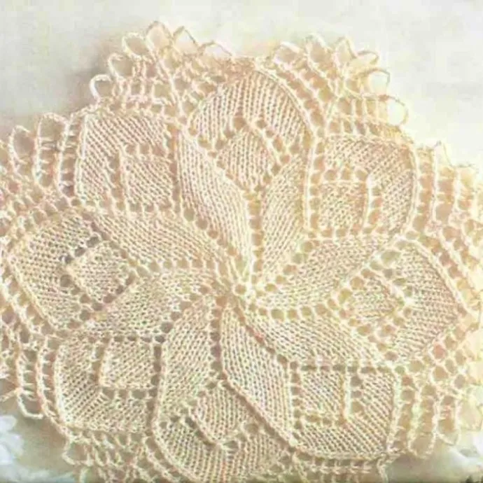 набрать 8 п., петли распределить на 4 спицы. Вязать по схеме 8 раз в ряду, т.е. 2 мотива на спице. Числа справа обозначают ряды. В отсутствующих на схеме рядах петли и накиды вязать лицевыми. После 42-го р. провязать крючком по 2 п. вместе, между ними выполнить арки из 7 в.п. Концы нити незаметно закрепить на изнаночной стороне работы. Салфетку выстирать вручную и высушить. Затем наколоть по размеру, при этом булавки вколоть в каждую арку из в.п., накрахмалить и дать высохнуть.