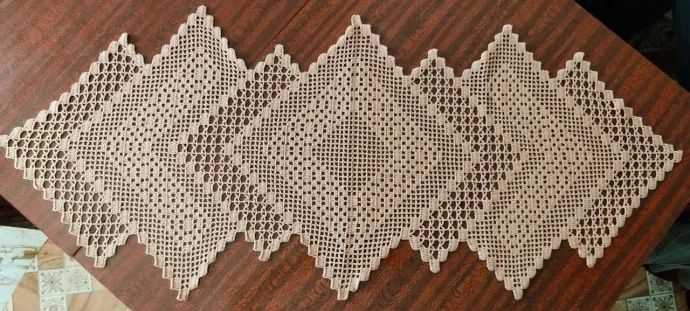 Графические фигуры заставляют сердце биться чаще. Вязаная в филейной технике салфетка-дорожка не оставит равнодушным любителей геометрических форм.