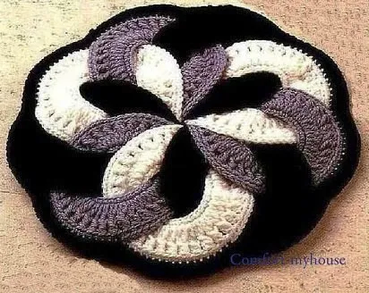 Нижнюю часть коврика вяжем по схеме столбиками с двумя накидами, а в последнем ряду для получения волнистого края столбики с двумя накидами, столбики с одним накидом, столбики без накида и в обратном порядке.