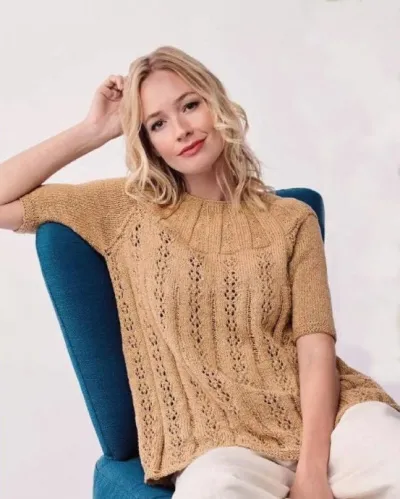 На спицы № 3.25 возвратить 20 (20, 21, 23, 24) петель рукава (они присоединятся к спинке) и провязать их лицевыми по лицевой стороне, 59 (64, 70, 76, 81) лицевых петель спинки, 20 (20, 21, 23, 24) лицевых петель второго рукава – на спицах 99 (104, 112, 122, 129) петель.