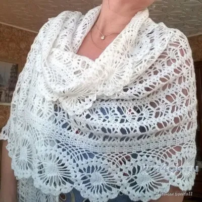 Палантин вяжется в одном направлении, кайма с двух сторон вяжется сразу с основным узором (схема прилагается). Количество раппортов основного узора – в зависимости от желаемой ширины палантина.