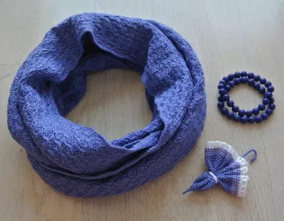 Для этого весеннего сезона я сделала комплект : снуд в два оборота и брошь. Комплект связан из хлопковых ниток " Ирис" фиолетового цвета.