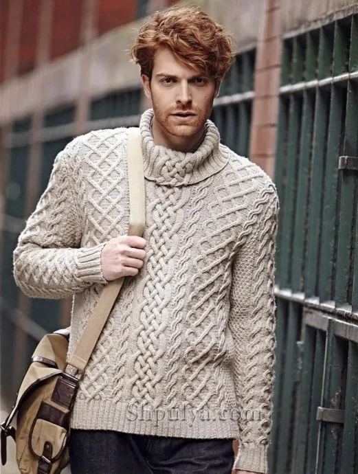 Великолепный мужской свитер с высоким воротом и аранами связан спицами №4,5 из 100% шерсти.